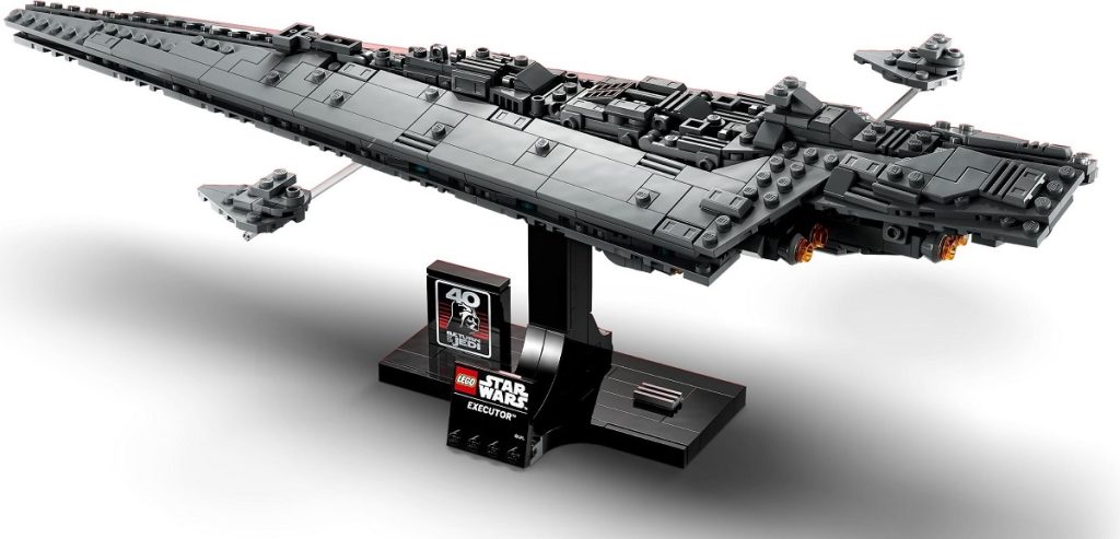 Ce n’est clairement pas un set destiné aux enfants : pas de minifig, pas de play feature, uniquement un bel objet à poser. Et dans cette discipline, il fait mouche : le stand est sobre mais sérieux, et l’Executor s’expose avec un angle dynamique.