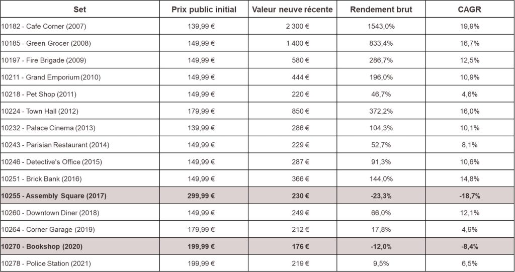 Le marché LEGO n’est pas une science exacte, même pour des gammes aussi stables que les Modulars. Un changement de politique chez LEGO, une baisse d’intérêt des collectionneurs, une surproduction en fin de vie… et la courbe de prix peut stagner, voire chuter.